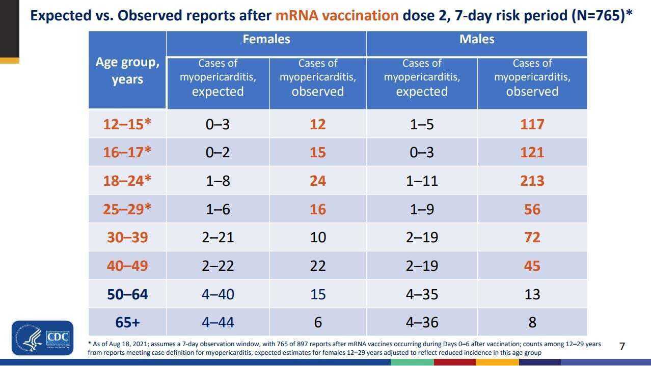 These numbers reflect the CDC’s own data: In 2021, the CDC found that males aged 12-15, showed an increase between 23.5 and 117 times. At the time this data was collected (August 2021), only 32% of teens in the US were vaccinated, so, this would mean that vaccinated males aged 12-15 had an observed incidence of up to 366 times the expected rate of myopericarditis — two distinct heart conditions occurring simultaneously. The 16-17 age group observed an even higher incidence.