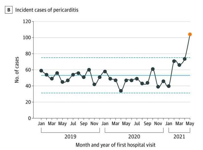 IWK is not the only health center to report an increased incidence of Myocarditis, Pericarditis and Myopericarditis. A study published to JAMA looking at 40 hospital records in the US titled “Myocarditis and Pericarditis After Vaccination for COVID-19” (Diaz et al.) found the rates went up even in adults who are less likely to suffer this side effect (see graph below).