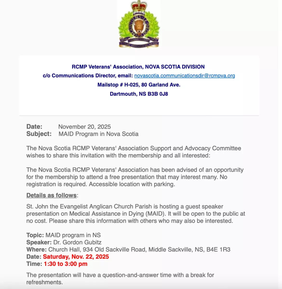 Nova Scotia RCMP veterans invited a man whose job is to facilitate, provide and promote nothing but death, and whose organization teaches clinicians how to introduce MAiD (assisted SUICIDE) to patients who didn’t ask for it, bring it up or want it in their life.