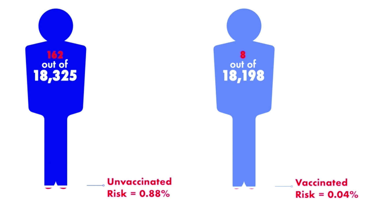 2. The alleged efficacy of 91% reported by Pfizer is misleading. The calculation of 91% represents the relative risk reduction when efficacy is near its highest. When the more revealing absolute risk reduction is considered, we find that the actual efficacy is only 0.84%. It is the absolute risk reduction that determines the risk-benefit-ratio required to make informed decisions around inoculation.