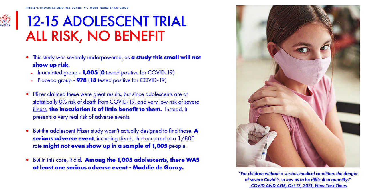 CCCA assembled a presentation that comprehensively demonstrates how Pfizer’s purported randomized placebo-controlled, double-blinded study veered away from methodologies that would have answered the safety and efficacy questions definitively. Following are 7 of the most compelling slides from its 51-slide report.